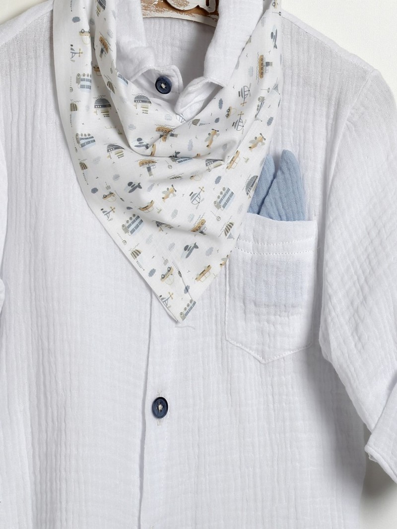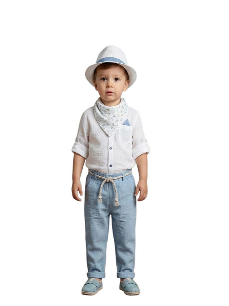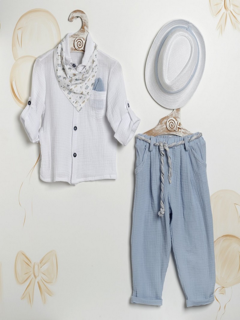 Βαπτιστικό κουστουμάκι οικονομικό σε μοντέρνες λευκές/γαλάζιες/σιέλ αποχρώσεις βαμβακερό 100% της Lollipop πλήρες σετ αποτελούμενο από άνετο παντελόνι σε απαλή γαλάζια/σιέλ απόχρωση με μοντέρνα ζώνη, βαμβακερό πουκάμισο διακοσμημένο με γαλάζιο μαντιλάκι, βαμβακερό φουλάρι διακοσμημένο με αεροπλάνα, καραβάκια και αυτοκινητάκια και ψάθινο καπελάκι στυλ καβουράκι.Το βαπτιστικό κουστουμάκι Lollipop περιλαμβάνει: