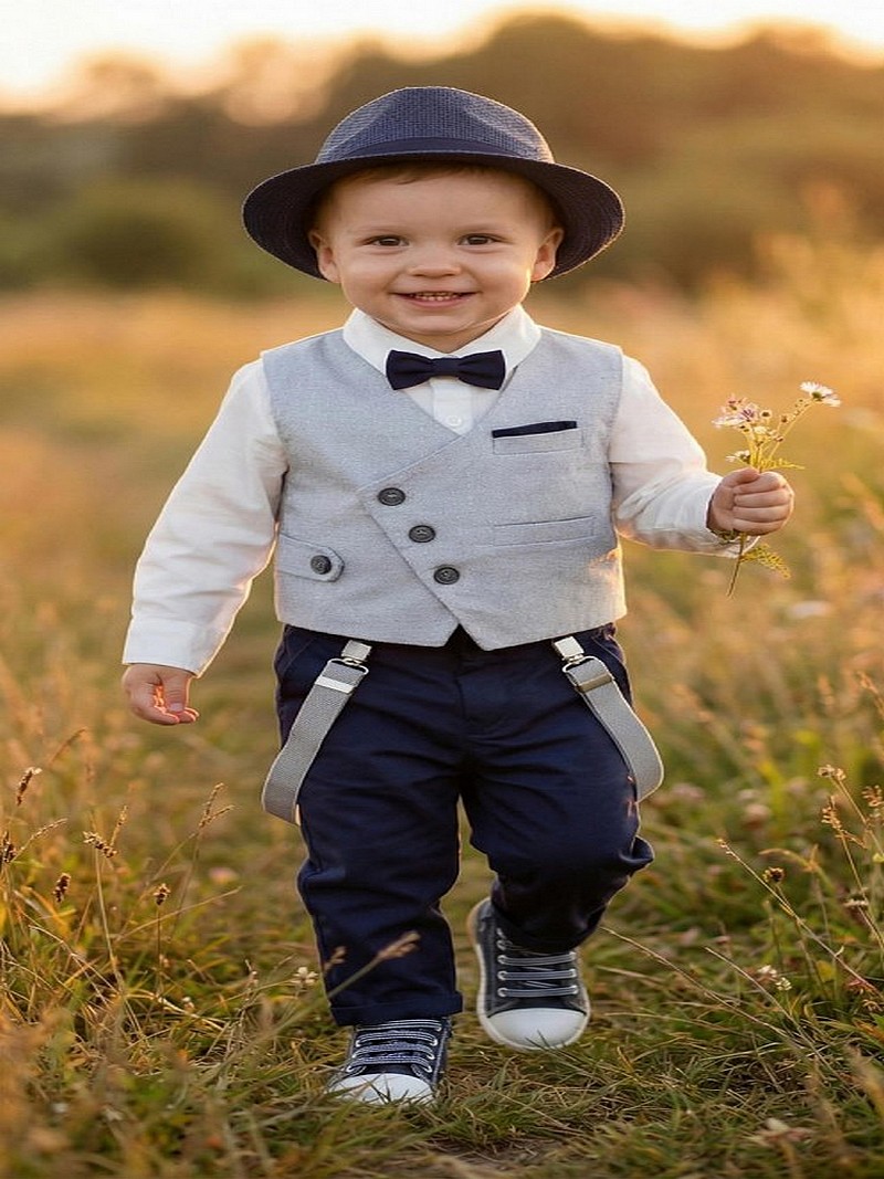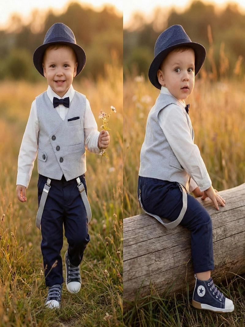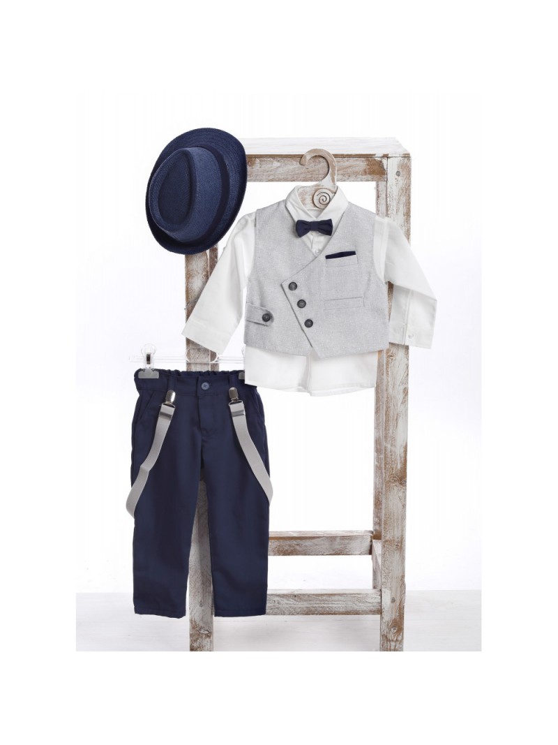 Βαπτιστικό κουστουμάκι σε λευκές/μπλε αποχρώσεις βαμβακερό 100% της Lollipop οικονομικό σετ μοντέρνο αποτελούμενο από μπλε παντελόνι με τιράντες, μονόχρωμο λευκό πουκάμισο, γιλέκο, παπιγιόν και ψάθινο καπελάκι στυλ καβουράκι.Το βαπτιστικό κουστουμάκι Lollipop περιλαμβάνει: