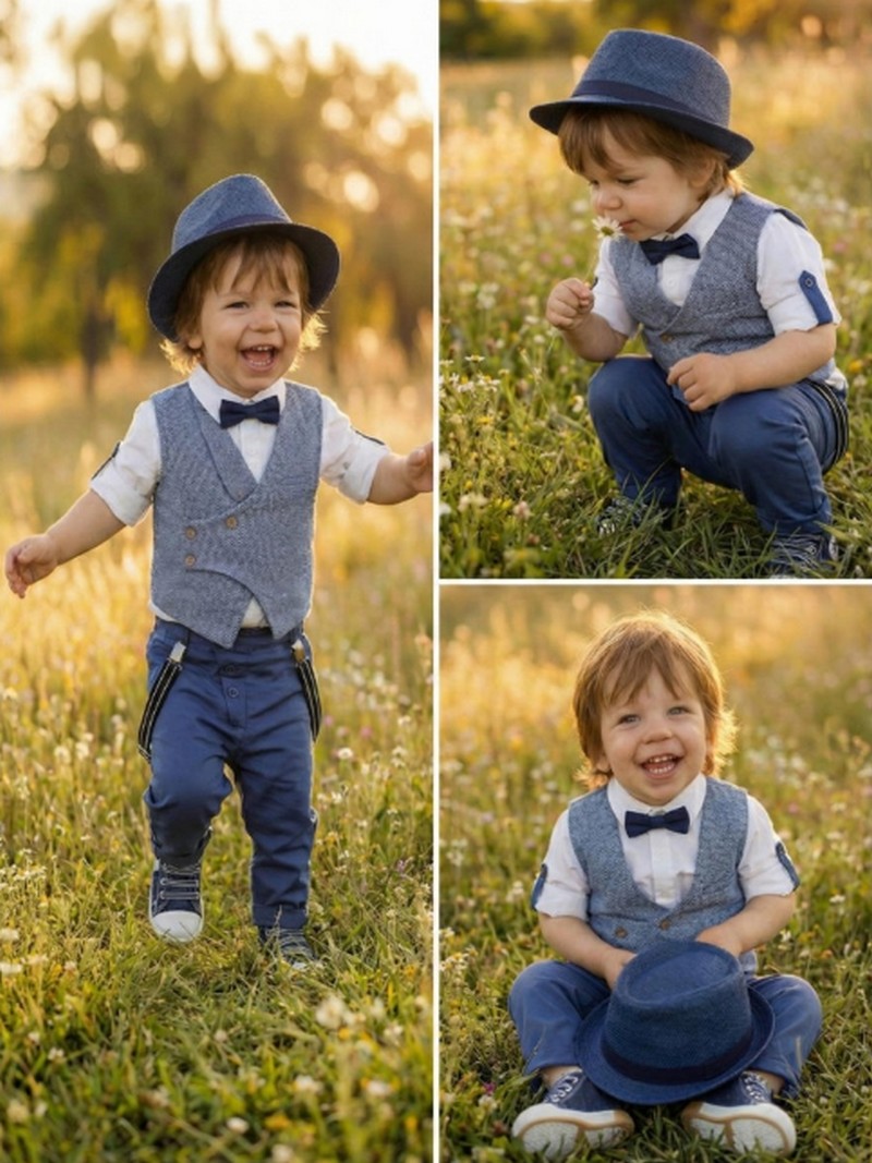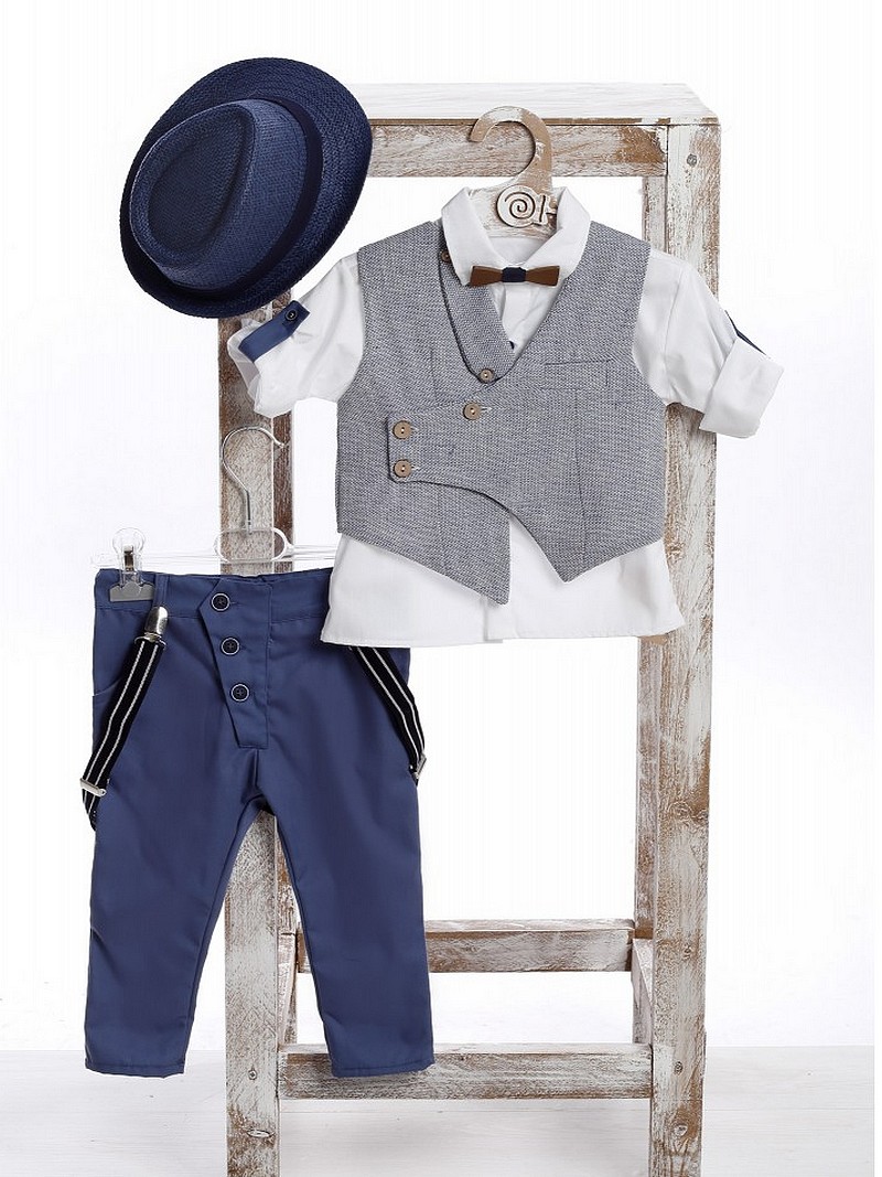 Οικονομικό κουστουμάκι βάπτισης σε λευκές/μπλε αποχρώσεις βαμβακερό 100% της Lollipop πλήρες σετ μοντέρνο αποτελούμενο από μπλε παντελόνι με τιράντες, μονόχρωμο λευκό πουκάμισο με μπλε τελειώματα, γιλέκο, παπιγιόν και ψάθινο καπελάκι στυλ καβουράκι.Το βαπτιστικό κουστουμάκι Lollipop περιλαμβάνει: