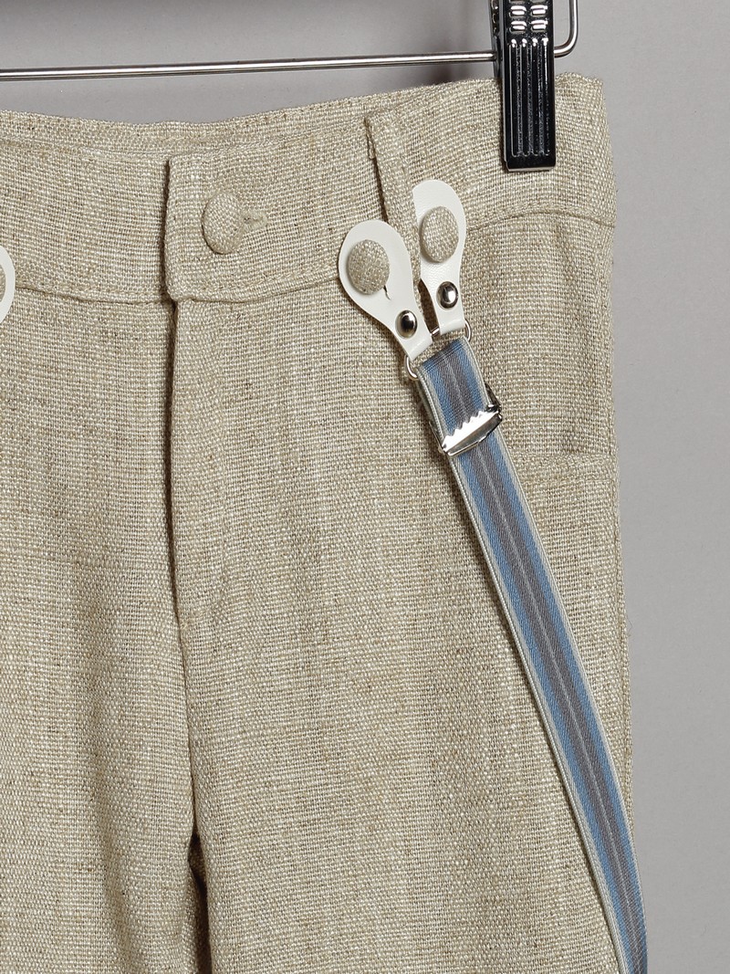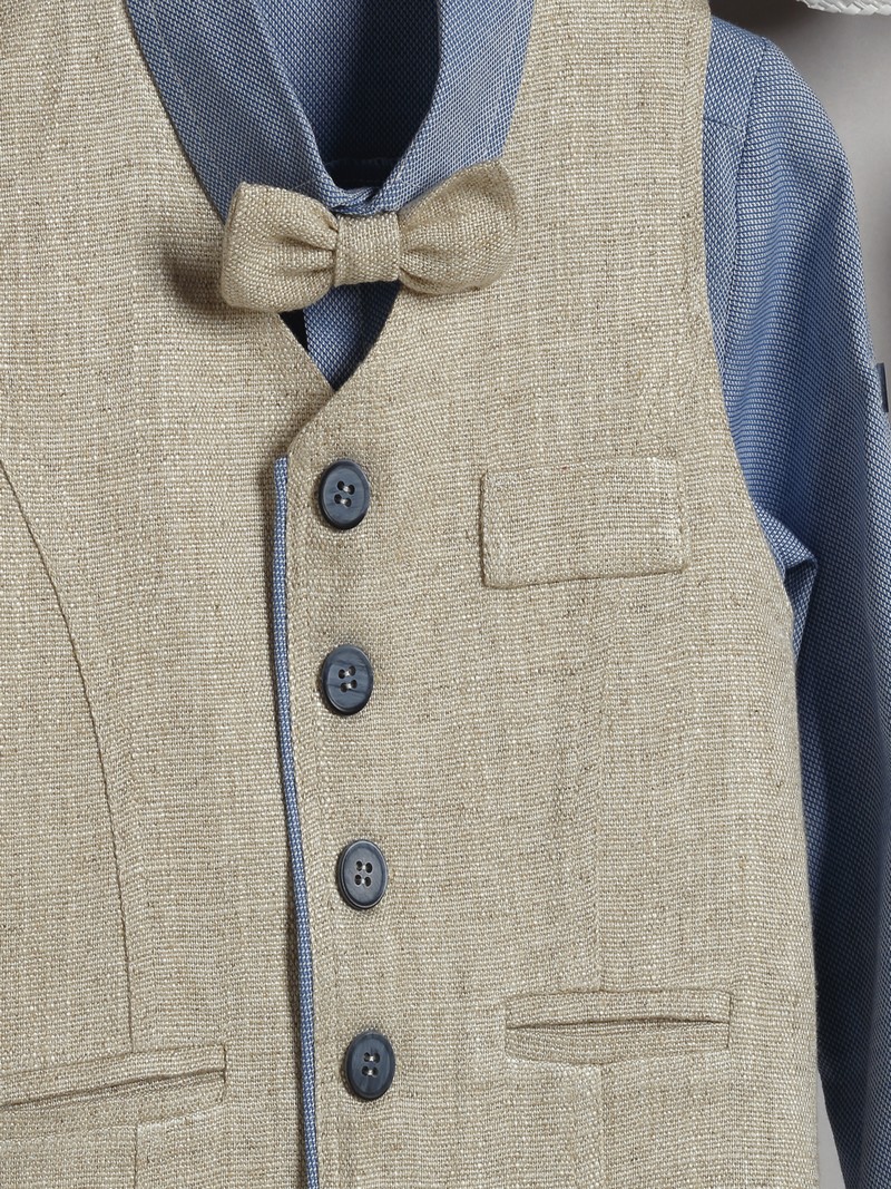 Κουστουμάκι βάπτισης οικονομικό βαμβακερό 100% της New Life μοντέρνο σετ αποτελούμενο από μπεζ βαμβακερ΄ή καμβάς καπαρντίνα παντελόνι με τιράντες, ραφ μονόχρωμο βαμβακερό πουκάμισο, μπεζ καμβάς γιλέκο, παπιγιόν και ψάθινο καπελάκι στυλ καβουράκι.Το βαπτιστικό κουστουμάκι New Life περιλαμβάνει: