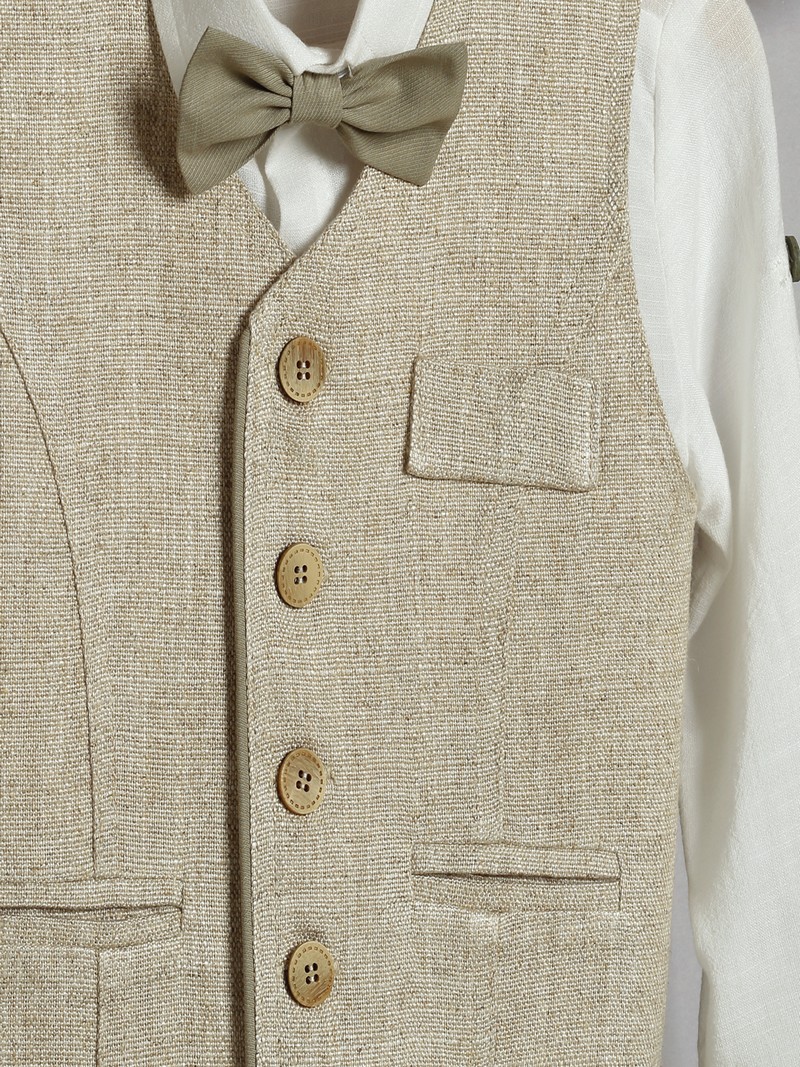 Βαπτιστικό κουστουμάκι οικονομικό βαμβακερό 100% της New Life μοντέρνο σετ αποτελούμενο από χακί βαμβακερ΄ή καπαρντίνα παντελόνι με τιράντες, εκρού βαμβακερό πουκάμισο, μπεζ καμβάς γιλέκο, παπιγιόν και ψάθινο καπελάκι στυλ καβουράκι.Το βαπτιστικό κουστουμάκι New Life περιλαμβάνει:
