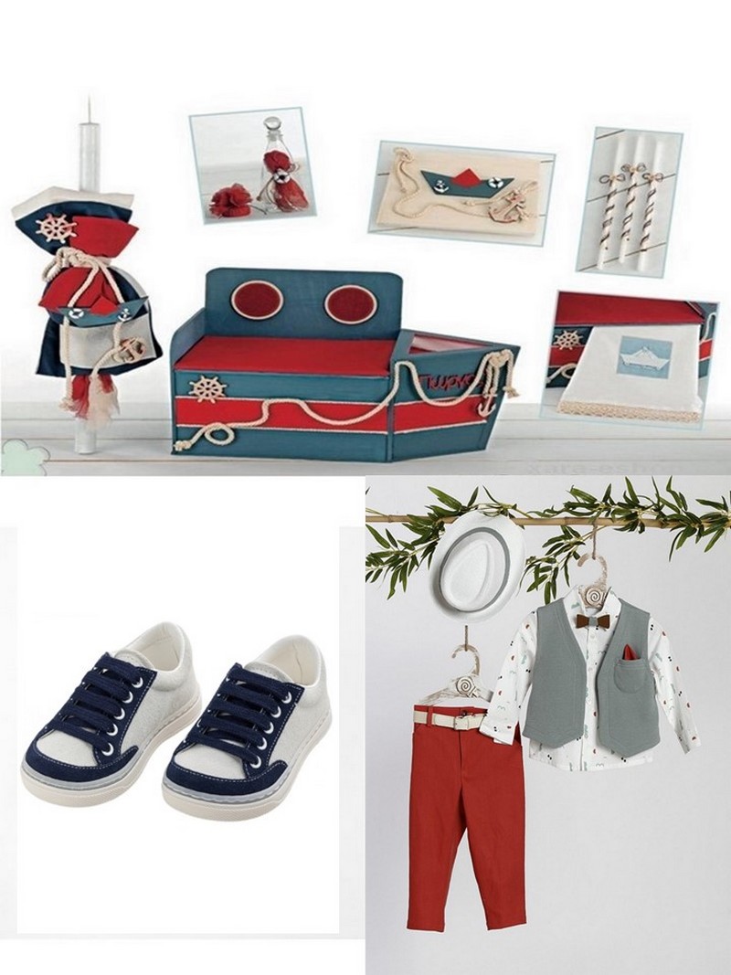 Ολοκληρωμένη βάπτιση για το αγοράκι σας σε χαρούμενες αποχρώσεις με προϊόντα των επώνυμων εταιριών Bellissimo, Lollipop και Everkid. Το πακέτο αποτελείται από κουστουμάκι βάπτισης με μοντέρνο κόκκινο παντελόνι, πουκάμισο με μικροσχέδια, γιλέκο, παπιγιόν και ψάθινο καπελάκι, σετ βάπτισης σε ασορτί αποχρώσεις με κουτί σε σχήμα καραβιού, λαμπάδα στολισμένη με θαλασσινά στοιχεία, λαδοσέτ, σετ λαδόπανα και 3 κεράκια για την κολυμπήθρα, όλα διακοσμημένα ασορτί .