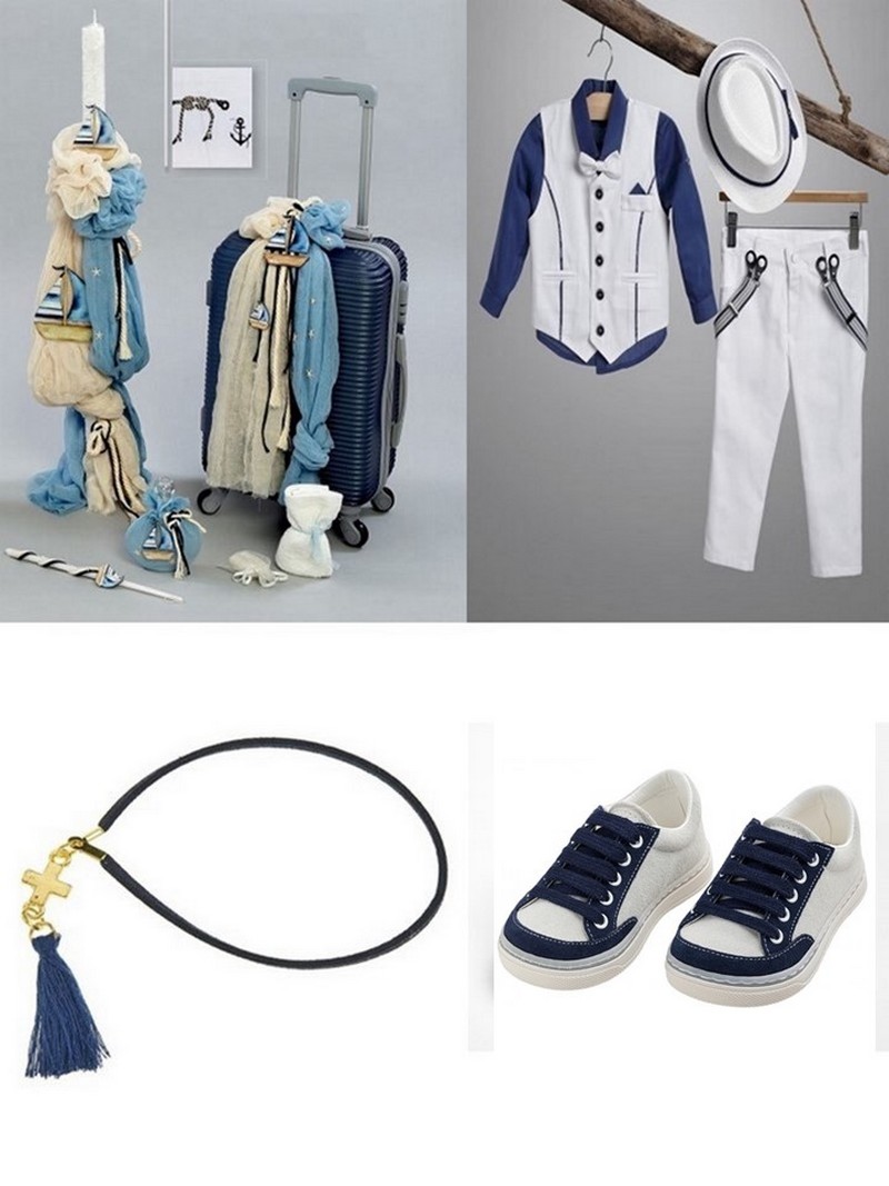 Ολοκληρωμένο πακέτο βάπτισης με θέμα "Καραβάκι-Ναυτικός" σε χαρούμενες αποχρώσεις, συνδυασμένα υπέροχα για μία παρουσίαση που θα ενθουσιάσει εσάς και τους καλεσμένους σας. Περιλαμβάνει κουστουμάκι της New Life με λευκό παντελόνι, τιράντες, μπλε βαμβακερό πουκάμισο, γιλέκο, παπιγιόν και καπελάκι, βαπτιστικό σετ Zivas με τροχήλατη βαλίτσα για εύκολες μετακινήσεις, λαμπάδα, σετ λαδιού (μπουκαλάκι και σαπουνάκι), λαδόπανα και 3 κεράκια για την κολυμπήθρα, όλα διακοσμημένα ασορτί με την ναυτική ζωή. Σας προτείνουμε και ανάλογα μαρτυρικά της φωτογραφίας με σήμα την άγκυρα (επιλέξτε πριν την προσθήκη στο καλάθι)