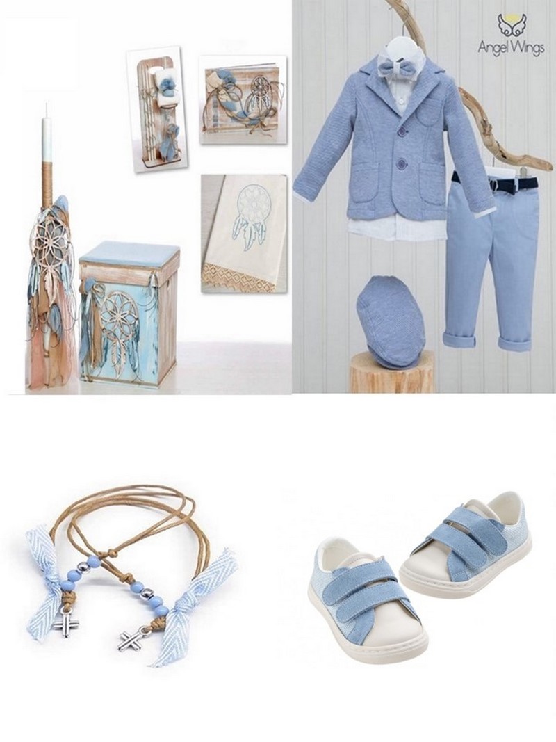 Ολοκληρωμένο πακέτο βάπτισης αγοριού με θέμα "Ονειροπαγίδα" σε μοντέρνα γραμμή, συνδυασμός προϊόντων των επώνυμων εταιριών Bellissimo, Angel Wings και Everkid . Αποτελείται από βαμβακερό ελαστικό παντελόνι, βαμβακερό πουκάμισο, δίκουμπο γιλέκο, παπιγιόν, καπελάκι και ασορτί σακάκι, σετ βάπτισης με ξύλινο κουτί που μπορεί να χρησιμοποιηθεί και σαν αποθηκευτικός ή διακοσμητικός χώρος στο παιδικό δωμάτιο, λαμπάδα, λαδοσέτ (μπουκαλάκι και σαπουνάκι), σετ λαδόπανα και 3 κεράκια για την κολυμπήθρα, όλα διακοσμημένα ασορτί με το θέμα της βάπτισης .