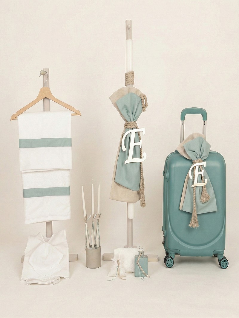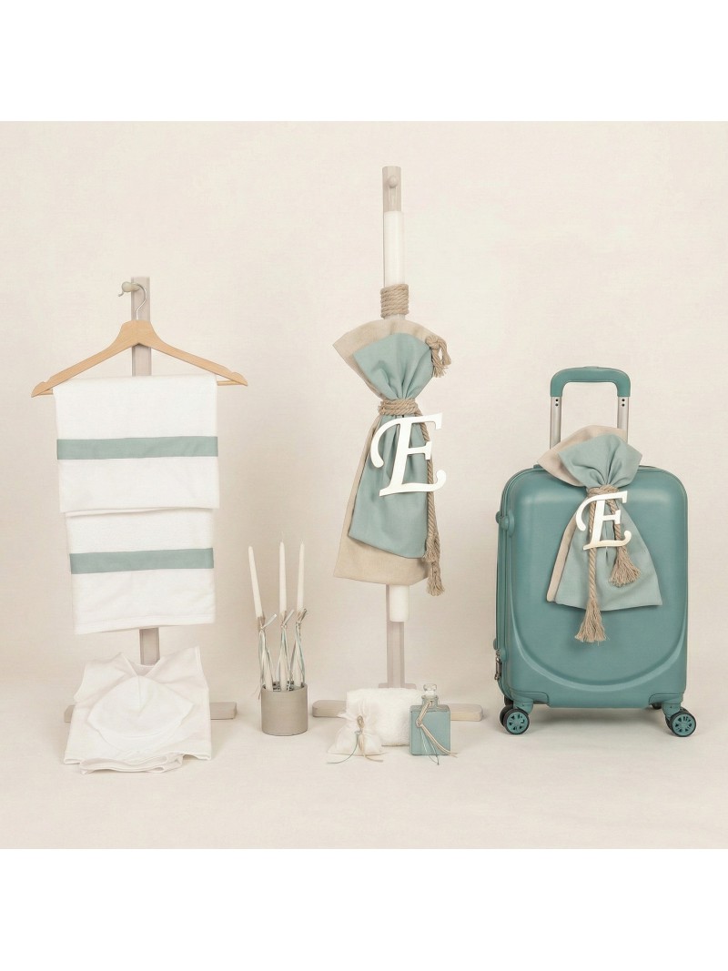 Σετ βάπτισης για αγόρι θέμα "Μονόγραμμα" πακέτο ολοκληρωμένο οικονομικό σε μπεζ άμμου/μέντα αποχρώσεις από την Nounos, με τροχήλατη βαλίτσα για εύκολες μετακινήσεις και μονόγραμμα, στολισμένη λαμπάδα με μονόγραμμα, πλήρης λαδόπανα με βαμβακερά εσώρουχα, λαδοσέτ (μπουκαλάκι και σαπουνάκι) και 3 κεράκια για την κολυμπήθρα, όλα ασορτί διακοσμημένα !!